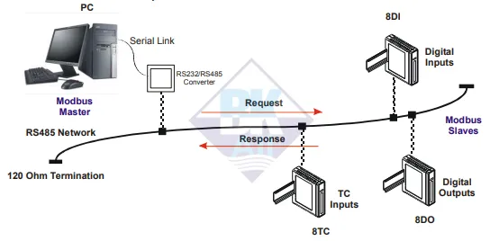 PC làm Modbus Master, các module PM16DI làm Modbus Slave