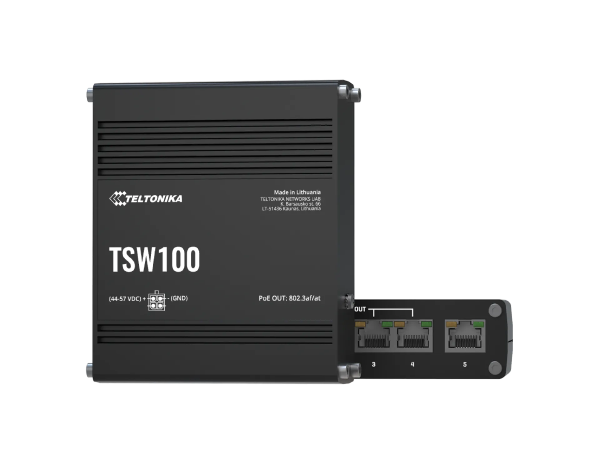 TSW100 is an unmanaged Gigabit Ethernet switch supporting Power-over-Ethernet. Classified as power source equipment (PSE), it centralizes the power supply, providing up to 30 watts per port and reducing installation effort. Five Gigabit Ethernet ports provide an economical high-bandwidth solution for a secure industrial Ethernet network.