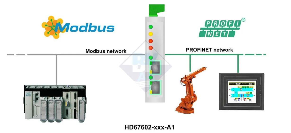 Bộ chuyển đổi HD67602-485-A1 chính là giải pháp. Thiết bị này đóng vai trò cầu nối (gateway) giữa hai thế giới truyền thông khác biệt – cho phép PLC trong mạng PROFINET đọc/ghi dữ liệu trực tiếp từ các thiết bị Modbus RTU mà không cần lập trình phức tạp.