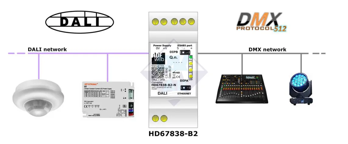 Bộ HD67838-B2 được đặt ở giữa hai mạng, đóng vai trò gateway chuyển đổi tín hiệu từ DALI sang DMX và ngược lại. Nó nhận dữ liệu DALI (ví dụ mức sáng, tín hiệu từ cảm biến) rồi ánh xạ sang kênh DMX tương ứng, cho phép điều khiển hiệu ứng ánh sáng DMX theo trạng thái môi trường hoặc lịch lập trình từ DALI.