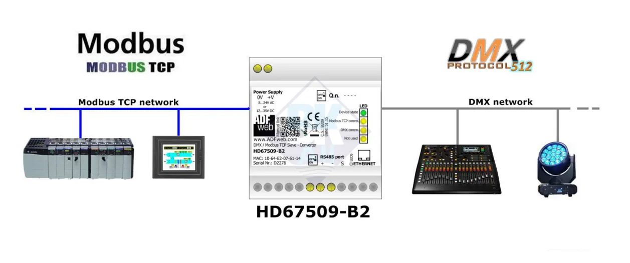 HD67509-B2 chính là giải pháp lý tưởng, cho phép các thiết bị Modbus TCP (PLC, HMI) có thể điều khiển hoặc giám sát trực tiếp các thiết bị chiếu sáng dùng giao thức DMX.