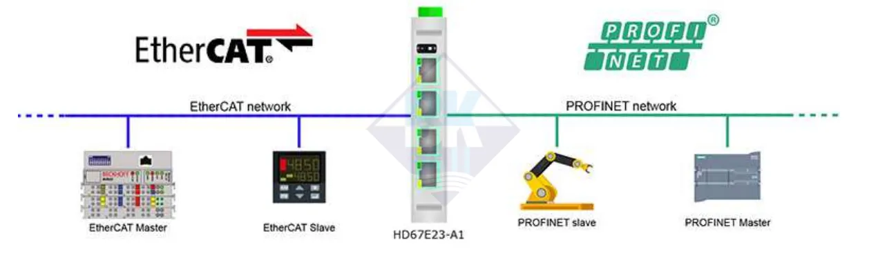 - HD67E23-A1: Là Slave trong cả hai mạng, đồng bộ dữ liệu I/O từ EtherCAT sang PROFINET và ngược lại.