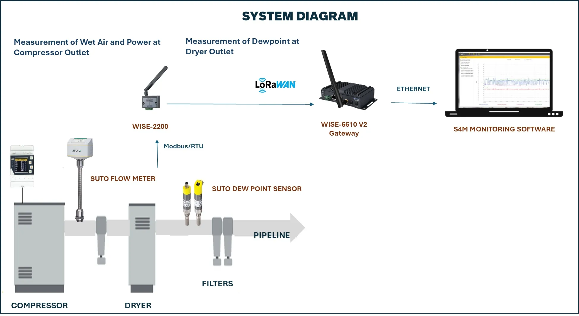 Hệ thống giám sát khí nén này sử dụng mạng cảm biến phân tán, bắt đầu từ các điểm đo như máy nén, bộ lọc và máy sấy, được trang bị đồng hồ đo lưu lượng SUTO và cảm biến điểm sương để thu thập các chỉ số như độ ẩm không khí, công suất và điểm sương. Dữ liệu được thu thập bởi một nút biên thông qua Modbus RTU qua WISE-2200, sau đó được truyền không dây qua giao thức LoRaWAN tầm xa đến cổng trung tâm WISE-6610 V2. Cổng này sau đó chuyển tiếp dữ liệu đã thu thập bằng Ethernet đến phần mềm giám sát trung tâm (S4M), cung cấp các chức năng phân tích thời gian thực, lập biểu đồ và quản lý cảnh báo.