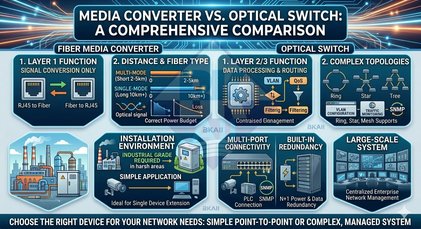 Việc lựa chọn giữa Media Converter và Switch quang phụ thuộc hoàn toàn vào bài toán hệ thống:
