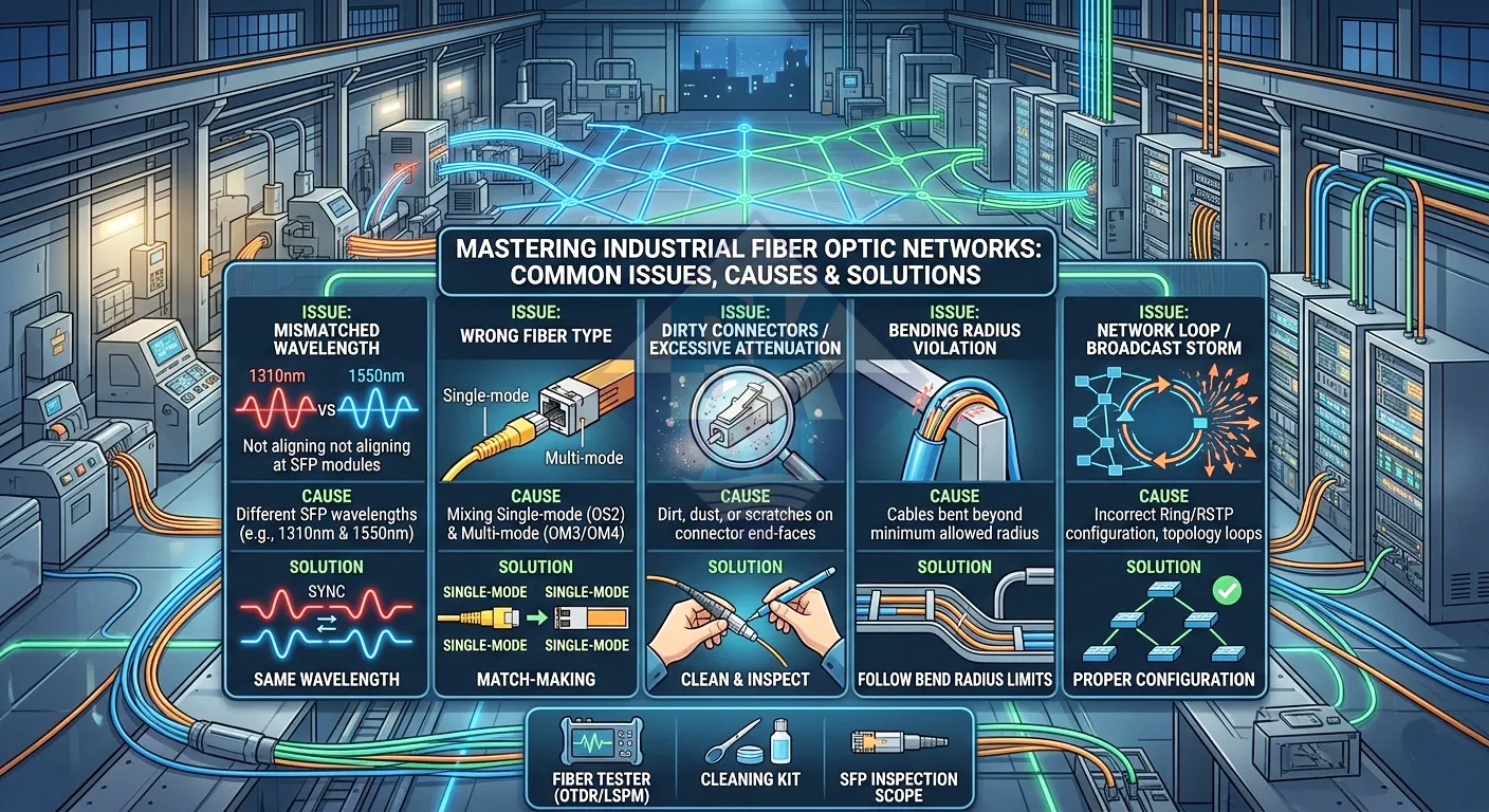 Trong các hệ thống mạng công nghiệp, cáp quang được đánh giá cao nhờ khả năng truyền xa, chống nhiễu tốt và độ ổn định cao. Tuy nhiên, trong quá trình triển khai thực tế, nhiều hệ thống vẫn gặp lỗi khiến tín hiệu không ổn định hoặc mất kết nối hoàn toàn.