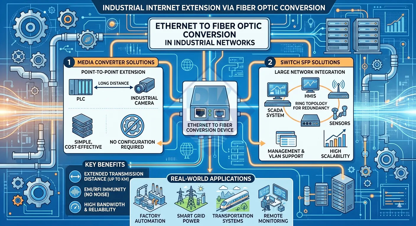 Trong các hệ thống mạng công nghiệp hiện đại, việc mở rộng khoảng cách truyền dẫn và đảm bảo tín hiệu ổn định là yêu cầu bắt buộc. Tuy nhiên, cáp Ethernet (cáp đồng) bị giới hạn khoảng cách (~100m) và dễ bị nhiễu trong môi trường công nghiệp.