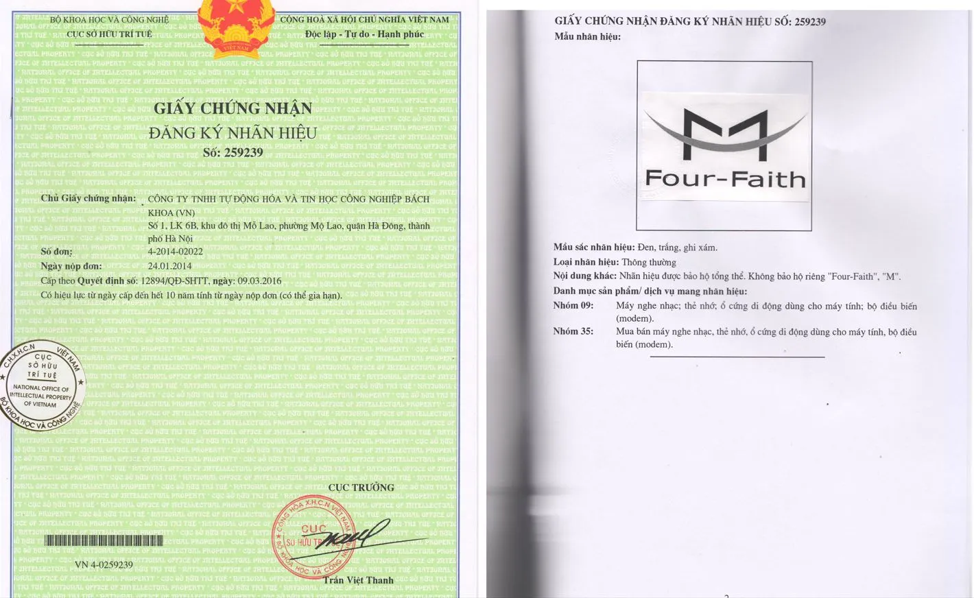 Ngày 9/3/2016, công ty TNHH tự động hóa và tin học công nghiệp Bách Khoa chính thức được Cục sở hữu trí tuệ cấp bằng sở hữu nhãn hiệu Four – Faith, bằng sở hữu có giá trị từ ngày 09/03/2016, trong phạm vi toàn lãnh thổ Việt Nam.