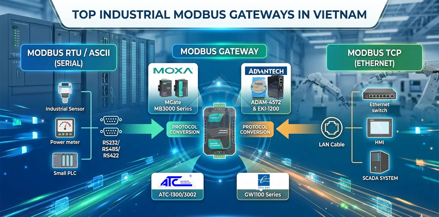 Top Modbus Gateway công nghiệp phổ biến: Moxa, Advantech, ATC