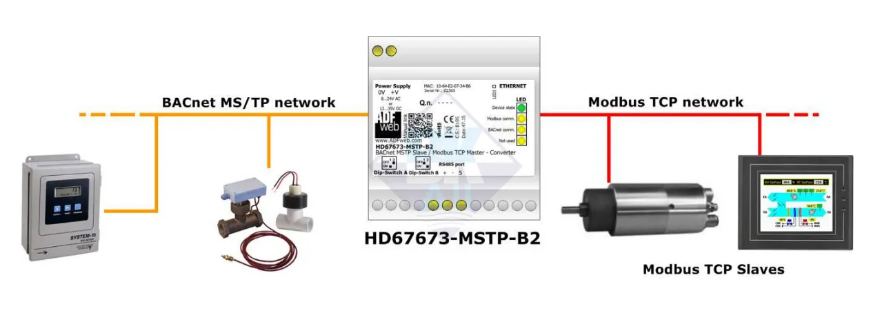 - HD67673-MSTP-B2: nhận dữ liệu từ BACnet MSTP dưới dạng Slave, chuyển đổi chúng sang dạng thanh ghi Modbus TCP để gửi tới HMI hoặc PLC Modbus.
