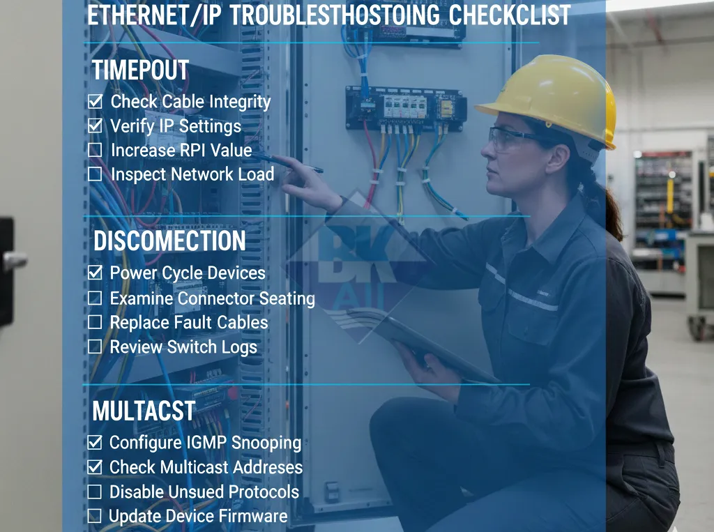 Trong môi trường nhà máy, Ethernet/IP thường phải hoạt động liên tục, thời gian thực và chịu nhiều tác động từ nhiễu điện, tải mạng, thiết bị mạng kém chất lượng hoặc cấu hình sai. Hôm nay BKAII sẽ giới thiệu tới các bạn một checklist kiểm tra nhanh giúp các bạn giảm thời gian downtime, khoanh vùng lỗi chính xác và xử lý hiệu quả.